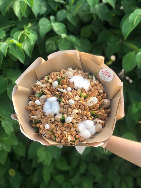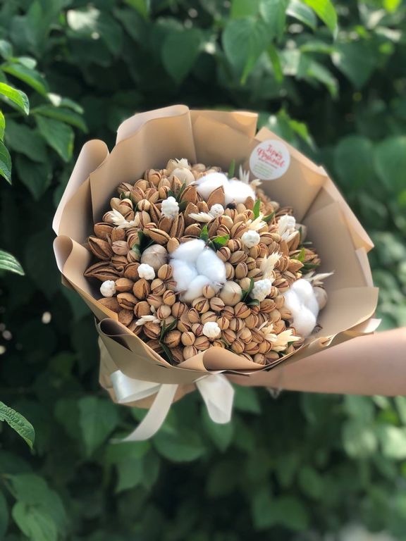 Состав: фисташки, пекан в скорлупе, миндаль в скорлупе, арахис в сахарной корочке, хлопок, флористическая зелень, сухоцветы