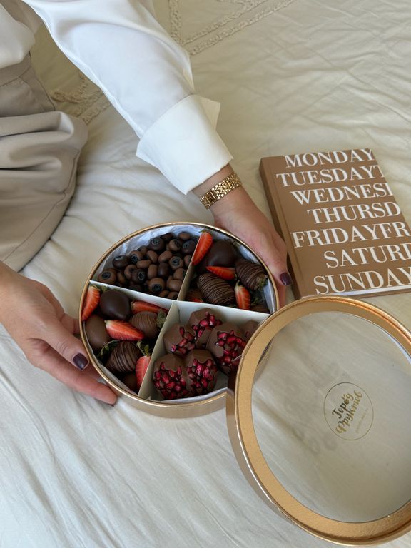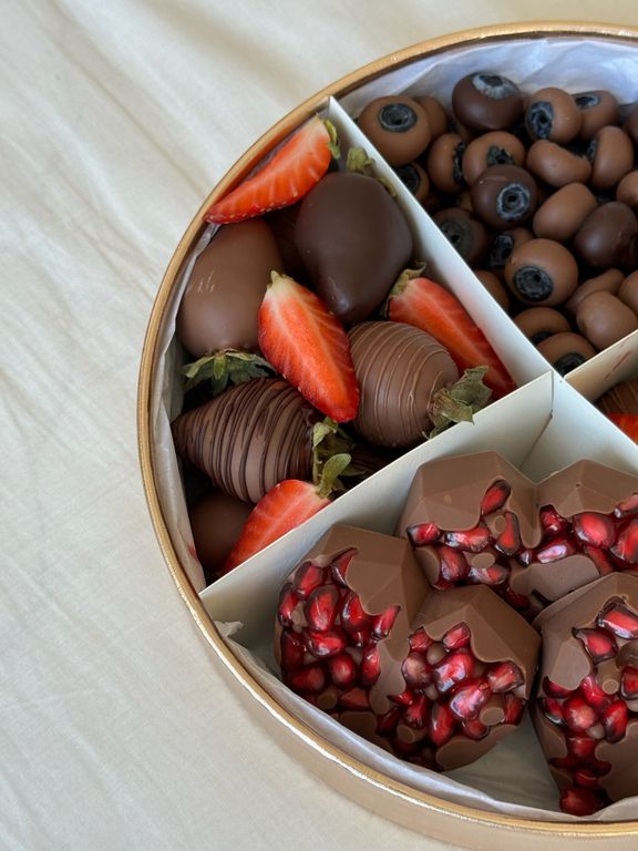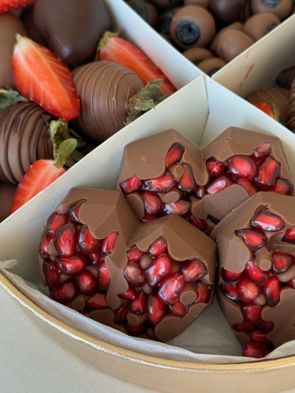 Сочные ягоды клубники в сочетании с молочным бельгийским шоколадом, голубикой и гранатовыми сердцами вместо тысячи слов!