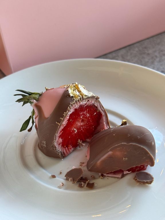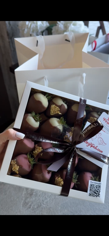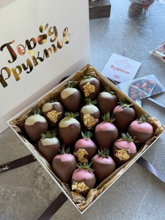 Свежая клубника в двойном слое шоколада, молочный, белый и клубничный. Вкус настоящего киндера, в сочетании с клубникой.