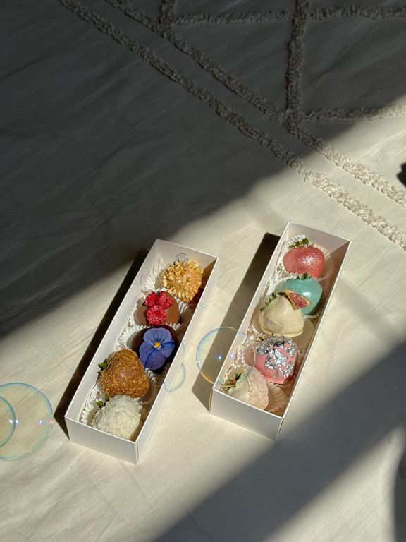 5 клубничек в бельгийском шоколаде с разными съедобными украшениями.