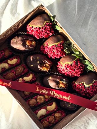 Бокс клубника в шоколаде - финики в шоколаде с дубайской начинкой - батончики шоколадные с орехами и сублимированной малиной.