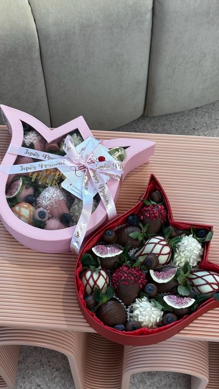 2 вида - нежный и яркий, в розовом белый и клубничный шоколад, в красном белый и молочный шоколад.